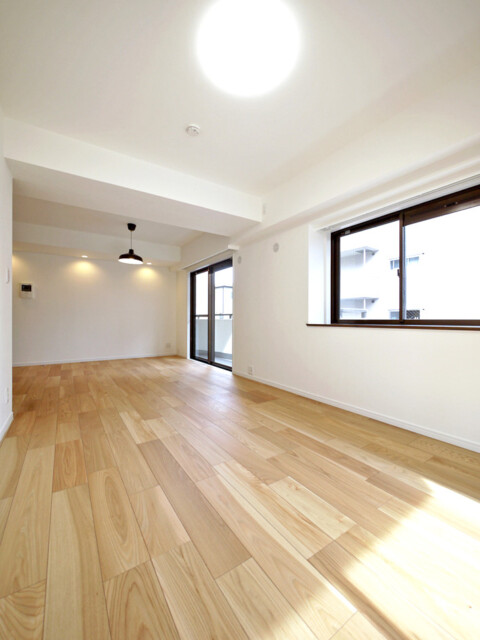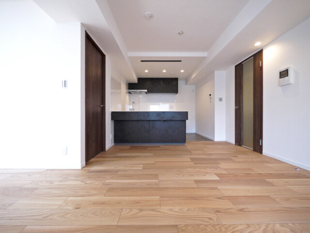 西向きバルコニーに面したお部屋です。縦長で入口からキッチン、ダイニング、リビングと並ぶオーソドックスなレイアウト。とはいえ幅が広めなのでリビングスペースもゆったりととれそうです。