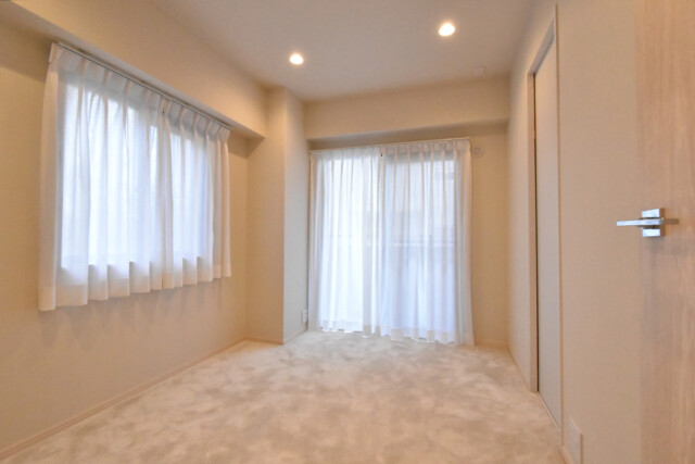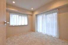 LDKを通らずに行ける独立性の高いお部屋です。南向きバルコニーと東向き窓の二面採光!明るく風通しも良さそうですね。こちらのお部屋も絨毯張り。