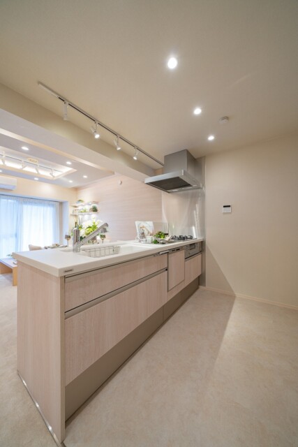 腰壁などがなくトップがフラットなので解放感抜群です。ダイニング側には浅い収納も付いていてカトラリーなどを入れておくのに便利ですよ。床はお掃除しやすいストーン調のパネル張り。