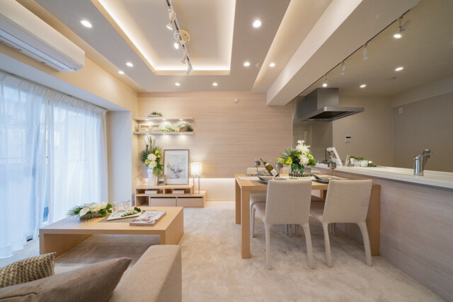 天井に立体的な造作が施されたり壁に木目パネルが貼られたりと、内装にはこだわり満載!!!設置された間接照明がより奥行きのある広がりを感じさせてくれています。家具は見本なので付いては来ませんが、ディスプレイしてもらえると生活のイメージがしやすくて助かります。大きさや色、素材感などの参考にさせてもらいましょう!