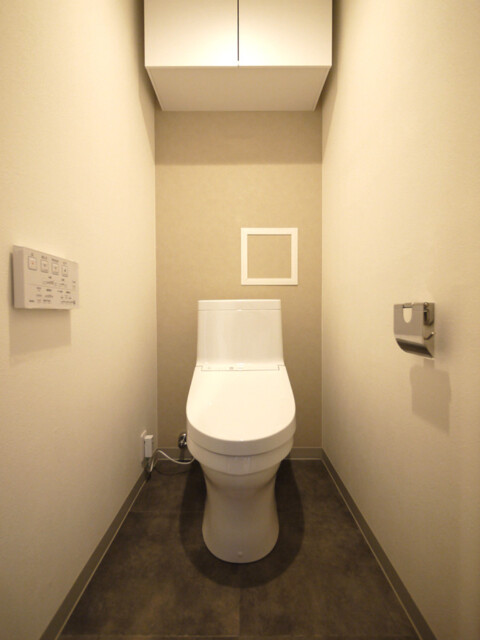 トイレは洗浄機能一体型。掃除道具の収納やトイレットペーパーストックに便利な吊戸棚も付いています。