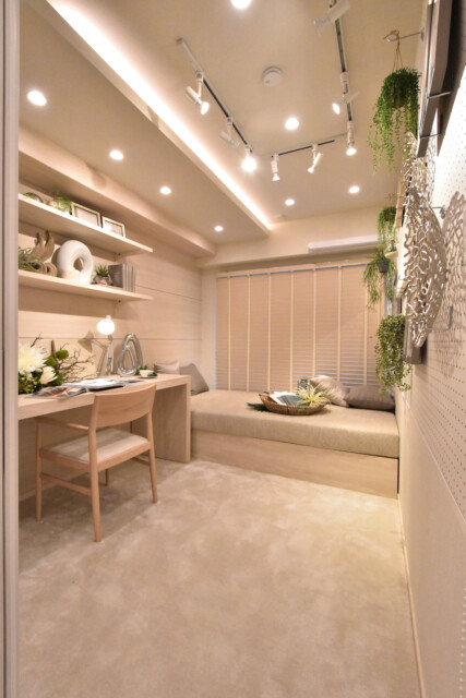 キッチン横にあるガラス張りのお部屋で、コンパクトながら窮屈な感じはありません。デスクやソファーベッド、棚などが造り付けになっていて書斎や子供部屋などご家族構成やライフスタイルに合わせて使うことができますよ。ブラインドが降りていますが、正面は南向きバルコニーに出られる窓になっています。