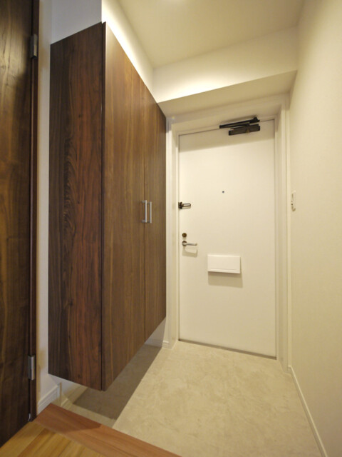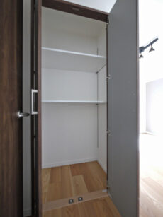 戸建て感覚で特別感がありますね。ただし、ここで気を付けなければいけないのは専有部分ではないということ。専用使用権の付いた共用部分という扱いなので管理規約によっては物を置けない場合もあるので要確認です。ドア横にはモニター付きインターホンが設置されていて室内から玄関前の様子を確認することが出来るので、わざわざ玄関まで来る必要もありません。