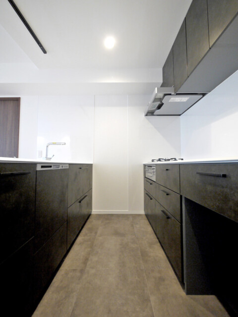 黒い金属調の調理台はスタイリッシュで高級感たっぷり。Ⅱ型でダイニング側にはシンクと食器洗浄乾燥機、壁向き側にはコンロが設置されています。収納や作業スペースも豊富でお料理好きにはたまりませんね。休日に家族そろってお料理をしたりなんていうのも楽しそうです♬
