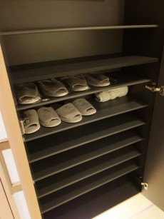 玄関を入ると右側にシューズBOXがあり、可動棚で高さ調節可能。