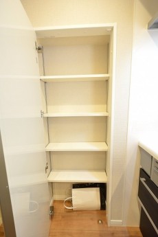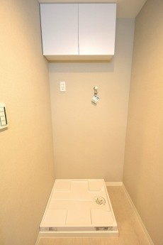 左側にランドリースペースがあり上部には吊戸棚も設置されています。