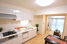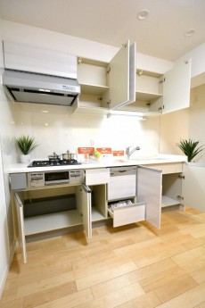 開放感のあるオープンタイプのキッチン設備は3口ガスコンロにグリル、浄水器一体型水栓など充実しています。
