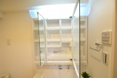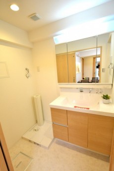 洗面化粧台は鏡の裏が一面収納になっており、ハブラシやコスメなどゴチャゴチャしがちなアイテムもすっきり仕舞っておけそう。お隣は洗濯機置場です。