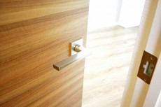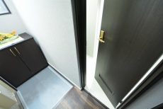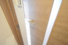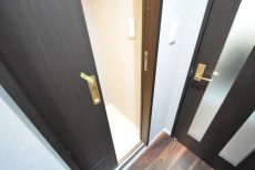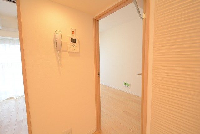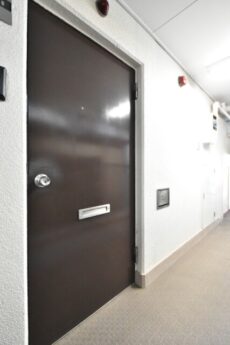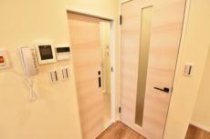 こちらがお部屋の玄関前です。インターホンはモニター付き。室内にあるモニターで訪問者を確認できるのは防犯面で安心できます。訪問者を確認した上で、応答するかしないかを判断可能です。