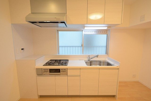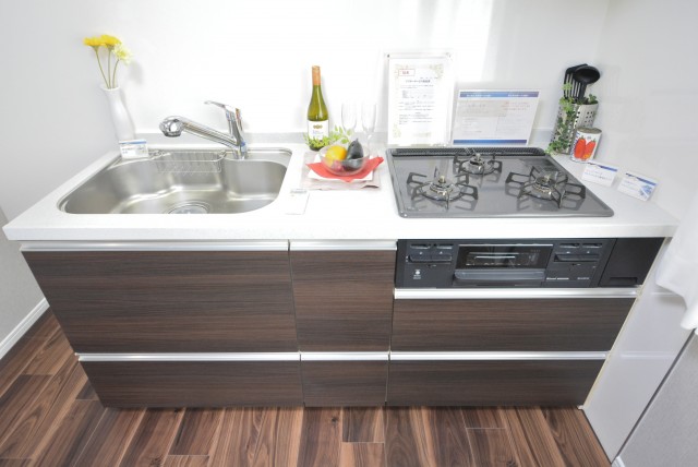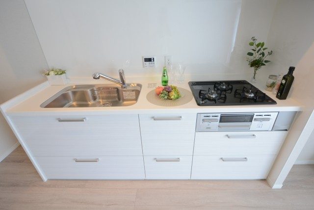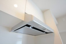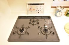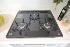 コンロは3口、魚焼きグリル付き。レンジフードは薄型タイプが採用されています。
