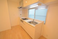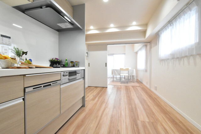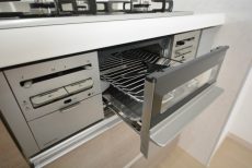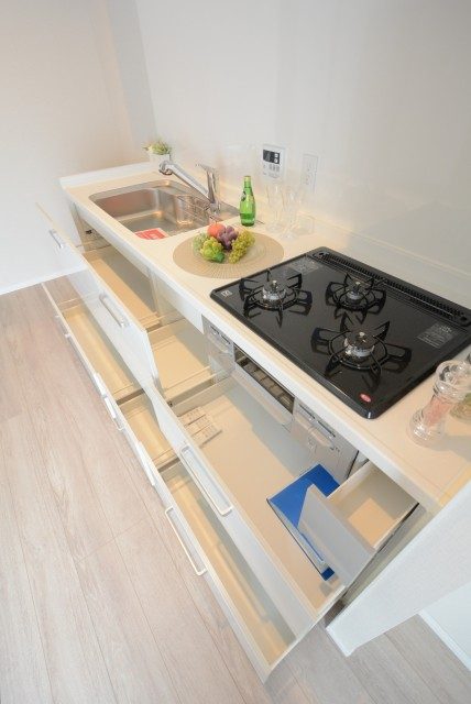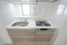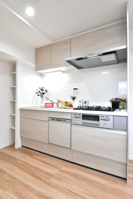 キッチン設備は3口ガスコンロにグリル、浄水器一体型水栓や食洗器も付いて充実しています。