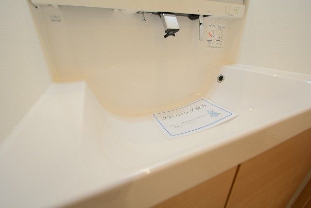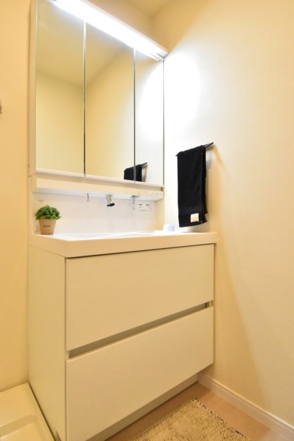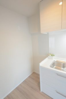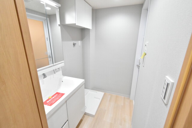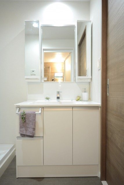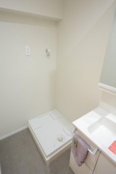 こちらが洗面室です。薄いグレーのクロスが貼られているためか、白い洗面化粧台が際立ちます。洗濯機置場上部には吊戸棚が設置されています。洗濯周りの雑貨はこちらに全て収まりますよ!