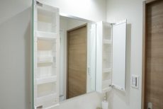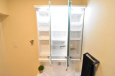 鏡の裏は全て収納となっております。キャビネット収納もご覧の通りしっかりと確保されています。