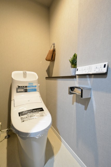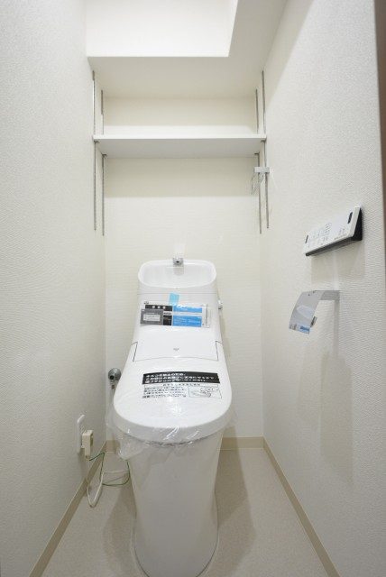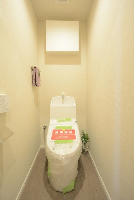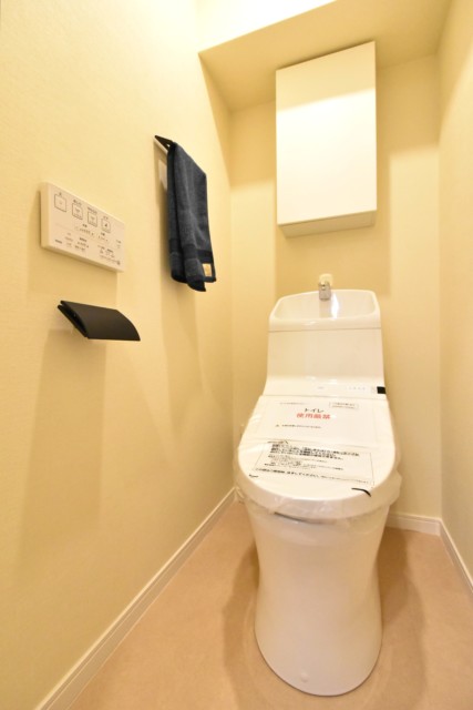 トイレの便座は温水洗浄暖房機能付き。トイレ上部には吊戸棚があり、トイレットペーパーのストックを入れておくのに重宝します。