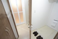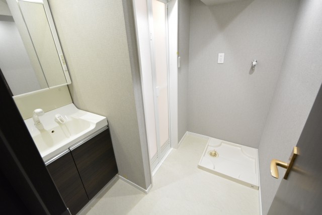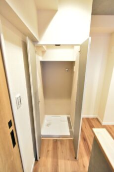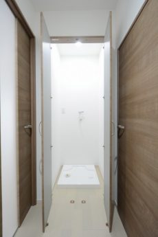 左側に洗濯機置場、右手に洗面化粧台がありますよ。