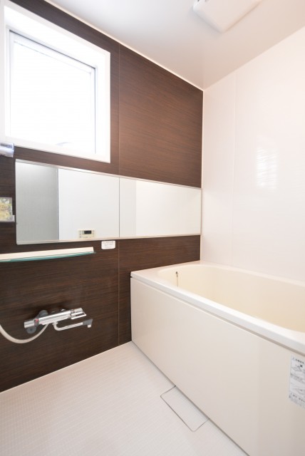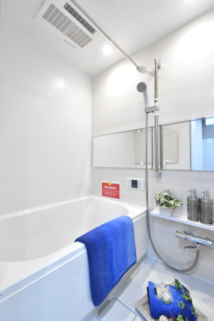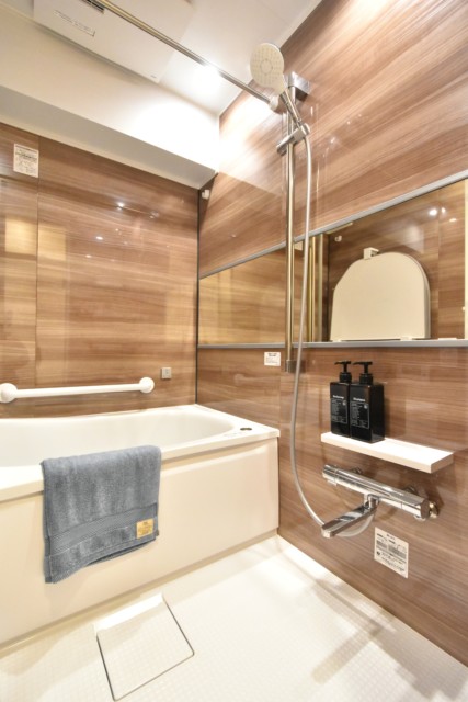 浴室には横に長いミラーが付いていますね。壁の端から端までミラーがあることによって浴室内を広く見せてくれる効果があります。リラックスの場としては開放感も重要な要素の一つですよ!!