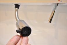 水栓は三面鏡下に設置されているタイプです。吐水口が固定されているように見えますが、実は引き出せるので便利にお使いいただけます!!