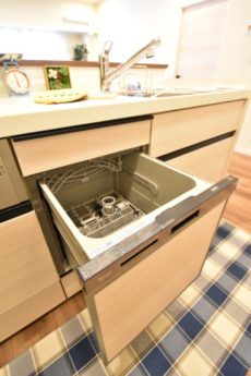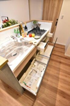 食器洗浄乾燥機完備。引出し収納はご覧のようにかなり充実しています。