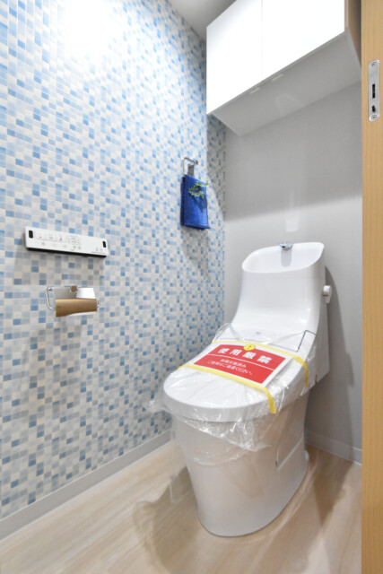 トイレです。青いタイル調のアクセントクロスが爽やかですね!