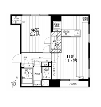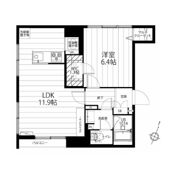 間取りのご紹介です。1LDK+WIC、専有面積は44.24㎡。7階。