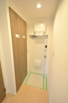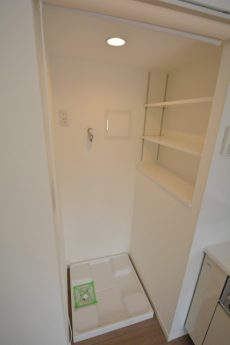 キッチンのお隣にロールスクリーンがあります。開けてみると、洗濯機置場。左手には、可動式の棚も設置されていますので洗剤や洗濯用品の収納に大活躍です。ロールスクリーンが有るので、お客様が来た時などに嬉しい設備です。