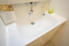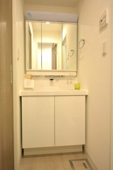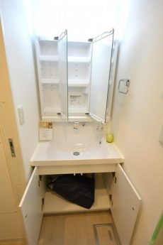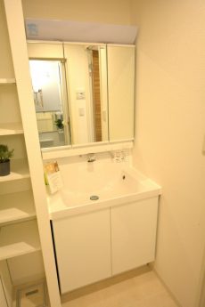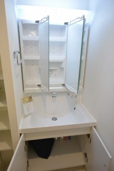 白で統一された清潔感のある洗面台は、三面鏡裏とカウンター下の収納に化粧品などの小物からタオルや掃除用具などの大きめの物までしっかりしまえます。