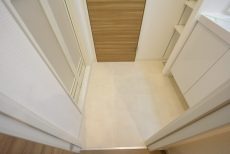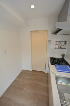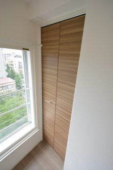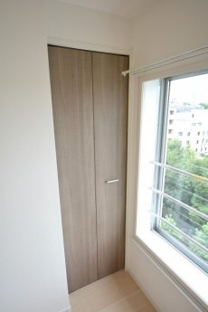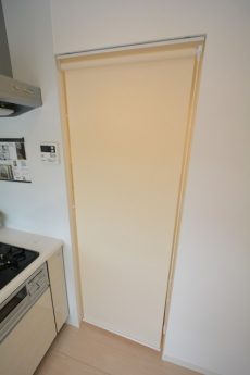 キッチンのお隣にロールスクリーンがあります。その向こうが、洗濯機置場です。右手に可動式の棚もありますので、洗剤などもしっかり収納できます。