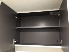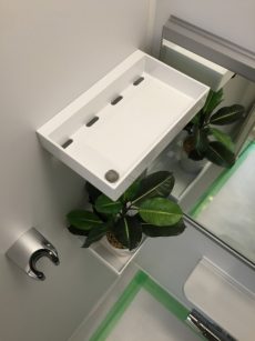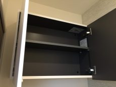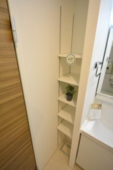 洗面台の横には、可動式の棚も設置してあります。リネンの収納もバッチリです。