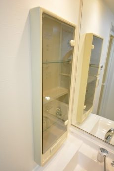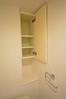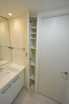 洗面台の横には収納スペースがありますので、歯ブラシから洗顔フォームまでゴチャゴチャ散らかりがちな洗面まわりの物はこちらにお仕舞いただけます♪♪ 右手には、可動式棚のリネン庫があります♪