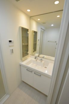洗面台は、大きな一枚鏡。真っ白な洗面台がステキです(´∀`)