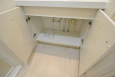 洗面化粧台の蛇口はひっぱるとシャワーになるのでお掃除もラクラクおこなえます。ボウルの下には、もちろん収納。