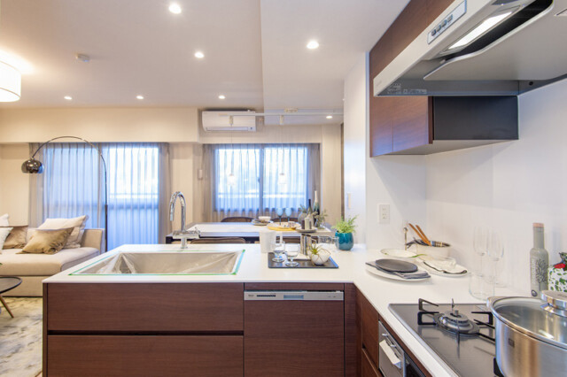 コンロ部分は壁を向いた奥まった位置で油跳ねの心配もなく、シンク部分はリビングダイニングを向いた開放的なポジション。いろいろなキッチンのいいところを集めたキッチンです。広い作業スペースや食器洗浄乾燥機など使いやすさも折り紙付き♬