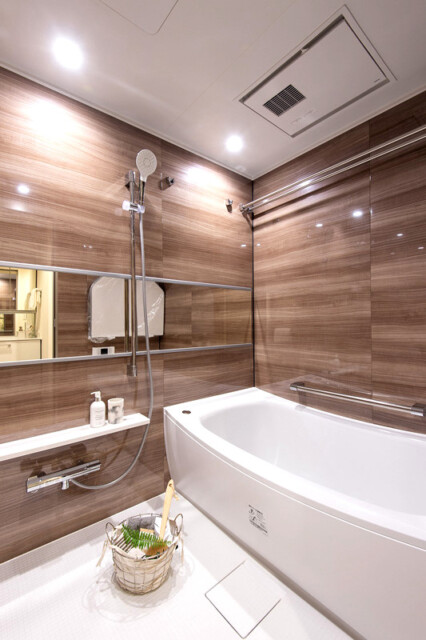 浴室はブラウンの木目パネル使用。鏡面仕上げで高級感たっぷりですね。一日終わりに、ここで温かいお湯に浸かれば疲れなんて溶けて行きそうです♬ 浴室換気乾燥機付きなので、お天気を気にせず洗濯機を回せますよ。