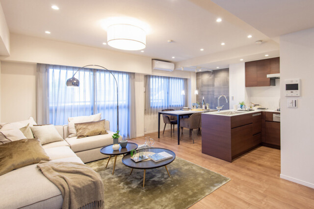 南西向きバルコニーに面したワイドスパンのお部屋です。入って右側半分にキッチンとダイニング、残り全部をリビングとして使えるようなレイアウト。自然の木目を生かしたフローリングを中心にアースカラーでコーディネイトされた室内は、とても居心地が良さそうです。