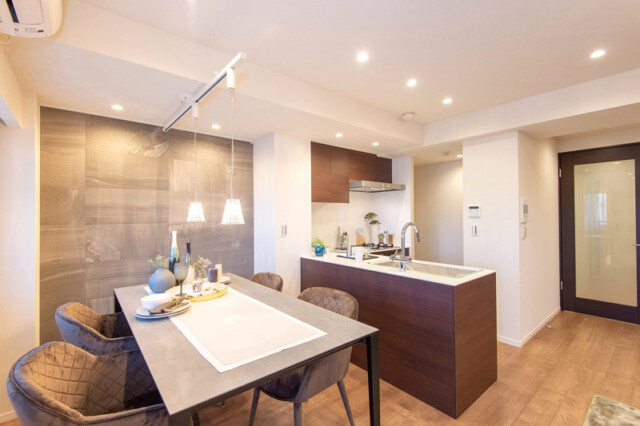 ダイニング部分にはアクセントウォール。これ、ただのオシャレだけじゃないんですよ。エコカラットといって、消臭や湿度調節をしてくれる機能性素材が使われています。昔の日本家屋で使われていた砂壁のような働きをしてくれるんですね。
