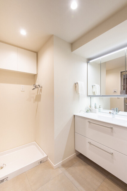 洗面室には洗面化粧台の他に、洗濯機スペースと浴室がまとまっていて脱衣所も兼ねています。洗面化粧台は身だしなみを整えるのに便利な三面鏡付き。低い位置にも鏡が付いて小さなお子様も使いやすくなっています。白とシルバーでまとめられていてとても清潔感がありますね。洗濯機スペースには吊戸棚付き。洗剤などはこちらへどうぞ!