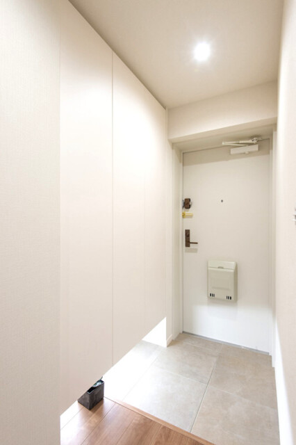 白を基調にした玄関は明るく実際より広々と感じさせてくれます。シューズボックスはトールタイプ。天井まで収納に使えて収納力抜群、玄関に散らばる靴をスッキリと片付けることが出来ますよ。空いている下の部分には、濡れた靴が乾くまで置いておいたり、普段履きのサンダルを置いたり出来て便利です。