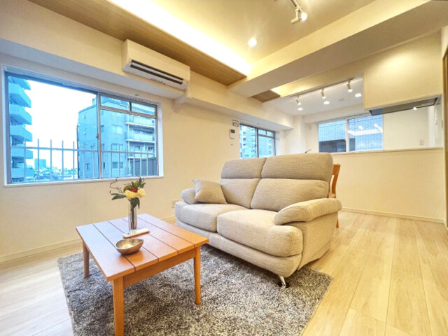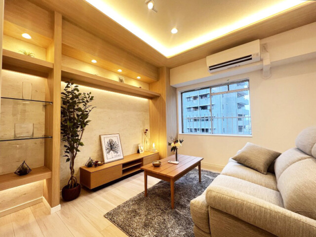 南東・北東向きの窓がある二面採光のお部屋です。明るく開放的なのに加えて風通しも良好。夜になれば間接照明が優しく照らしてくれまた違った雰囲気になりそうです。