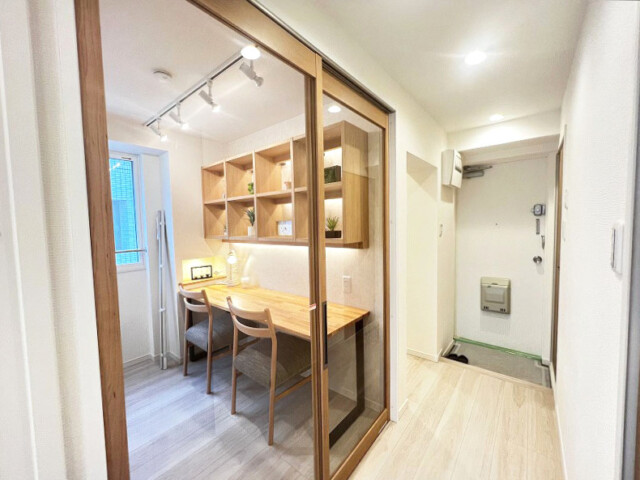 ワークスペースというとLDK の片隅にコーナーとして作られていることが多いですが、こちらは独立したお部屋になっています。書斎として在宅ワークに重宝しそうですね。ガラス戸にすることによって南東向きの窓からの光が廊下まで届くようになっています。