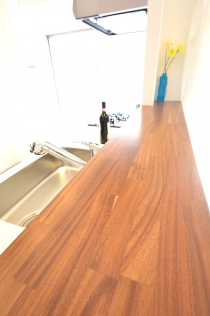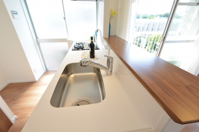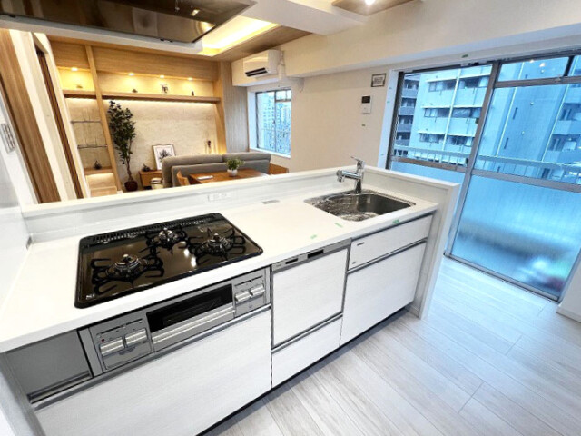 正面の見晴らしがいいのはもちろん、後ろと横を窓に囲まれたとても開放的なキッチンです。キッチンに立つ側からすると腰壁が手元を隠してくれるのは有難いですね。新規設置のシステムキッチンには食器洗浄乾燥機や浄水機能一体型水栓などのアシスト機能も充実!食後はのんびり過ごせそうです♬