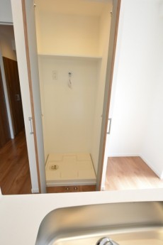 キッチンのシンクの後ろの扉が、洗濯機置場になっています♪♪