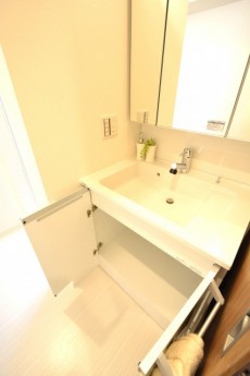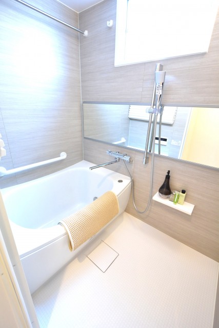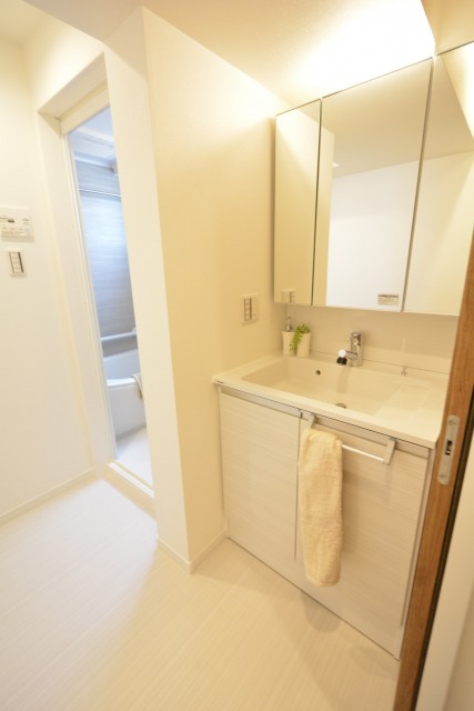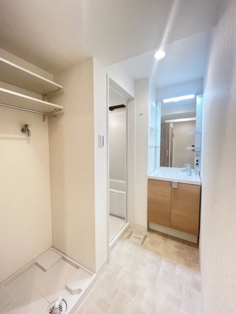 洗面室には洗面化粧台の他に洗濯機スペース、浴室がまとまっていて脱衣スペースを兼ねています。洗面化粧台の横には棚が付いているので洗面周りの細々としたものもスッキリ片付けることが出来そうですね。ランドリー用品は洗濯機スペース上部の棚の方へどうぞ。取付けられたハンガーパイプが意外に役立ってくれますよ。