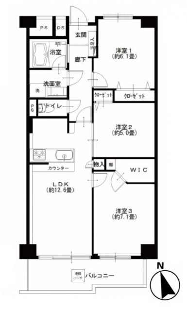 縦長のお部屋で、入口からバルコニーにかけてキッチン、ダイニング、リビングと並んだオーソドックスなタイプ。幅があるのでリビングも余裕を持ってレイアウト出来そうですね。リビングを綺麗に保つのに役立つ収納付き。