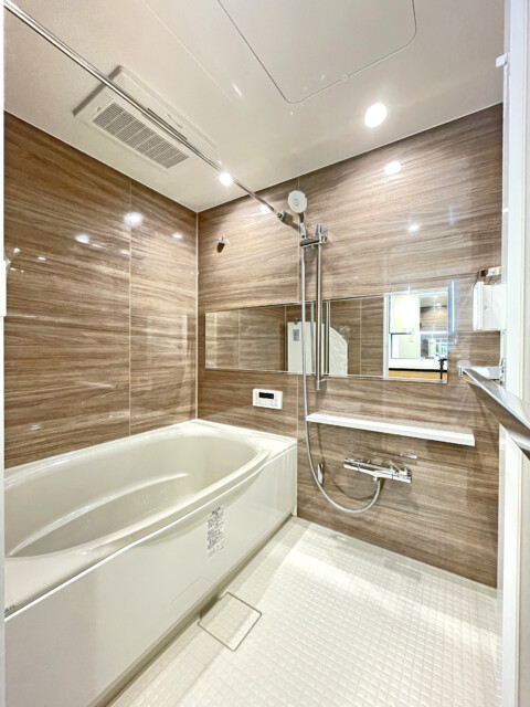 ホワイト基調で清潔感のある明るいバスルームは追焚き・浴室乾燥機付きで浴槽のポップアップ栓が手前にあるのが嬉しいですね!