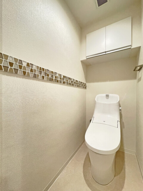 トイレはINAX製の洗浄機能付き。トイレットペーパーのストックや掃除道具をしまっておくのに便利な吊戸棚も付いています。アクセントのタイルいい感じすね♪