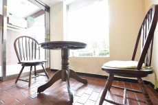 エントランスホールに置かれたテーブルの向こうは神田川がすぐそこにあり、神田川の緑を身近に感じます。