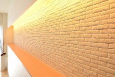 壁際はカウンターになっていて、アクセントウォールと照明も設置されています。