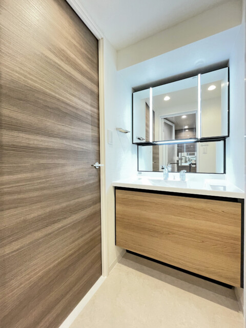 【洗面室:三面鏡付き洗面化粧台・洗濯機スペース】