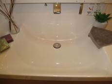 洗面化粧台はツルッとした大き目のボウルが機能的。三面鏡の裏側はキャビネット