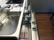 上部には収納がありませんが、シンク下の収納は、スライド式なのでキッチングッズの収納も楽々 (●´∀`)配管を気にせず収納できるので大容量。
